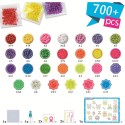 - This complete arts and crafts bead set includes 700 beads of 31 kinds, layout tray, sprayer, keychain attachments, keychain straps, and template sheet with instructions.