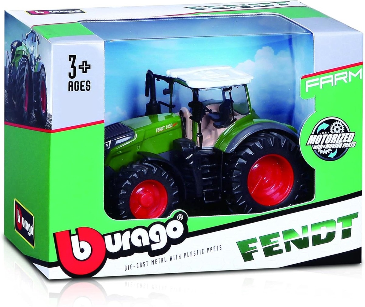 Detailed 10cm model of a Fendt 1050 Vario farm tractor. The chassis and mud guard sit above four chunky wheels with authentic looking deep tread tyres. At the top of the steps is the open view cabin that features full interior details just like any other Bburago model vehicle.