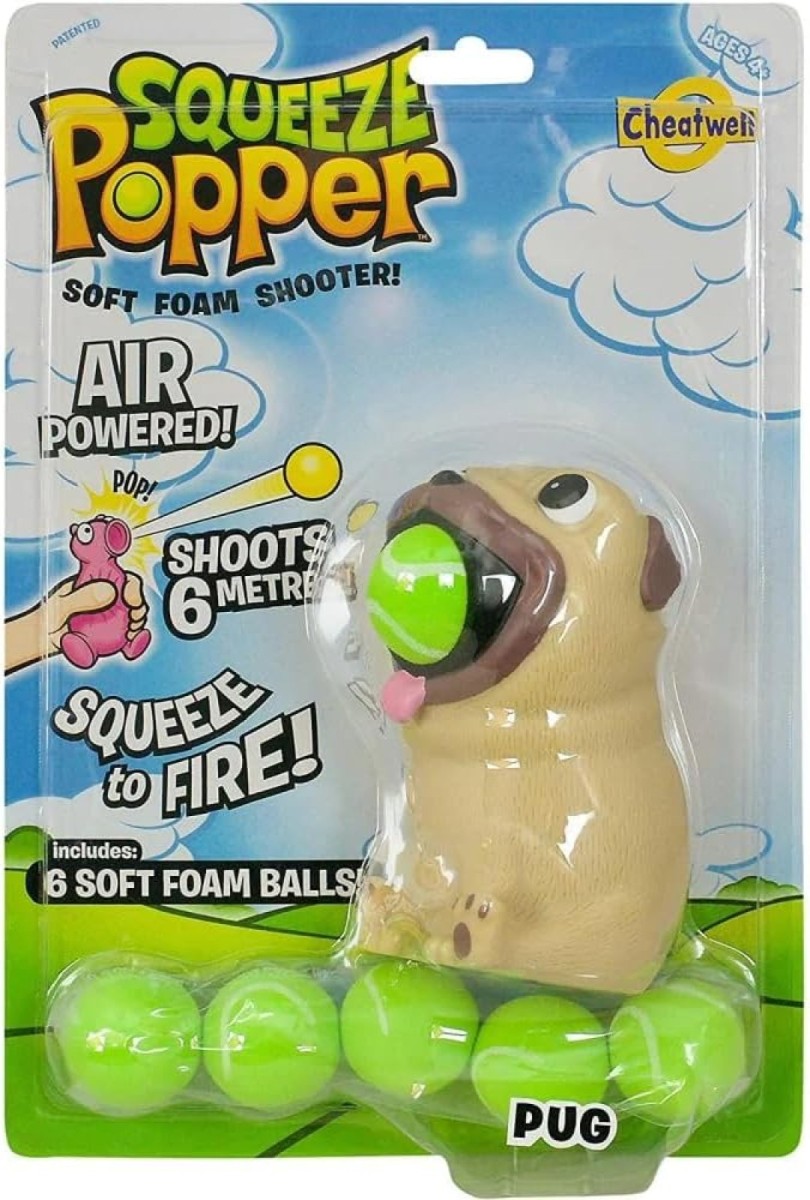 - Pug Popper comes with 6 soft foam green 'tennis balls'