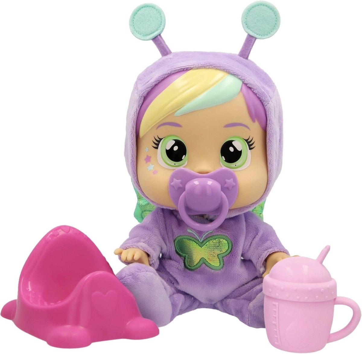 - Susi wears cuddly purple and green pyjamas with a cute butterfly detail, perfect for comforting play and bedtime routines.