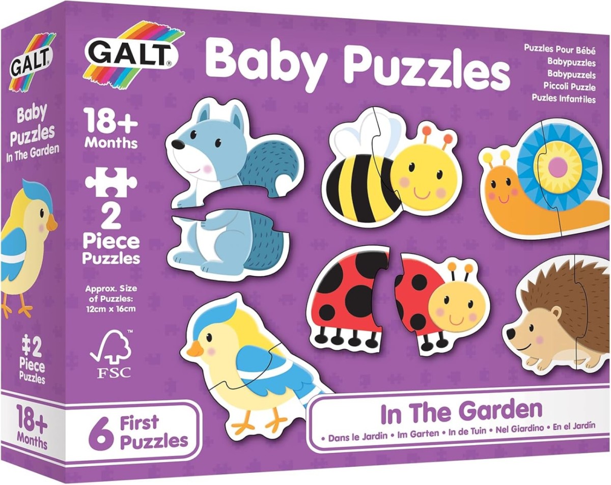 - The In The Garden baby puzzle set includes a set of 6 shaped two-piece puzzles. These simple colourful puzzles with chunky pieces encourage early matching skills and manual dexterity.