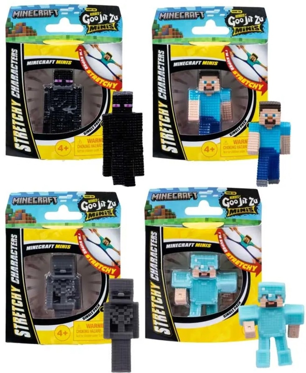 There are six Super Stretchy Mini Figures to collect. Many of your favourite Minecraft characters are available in this Mini Goo Jit Zu range including Steve, Alex, Diamond Steve, Enderman, Skeleton, and Creeper!