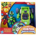 - The poseable Iron Hulk Super Hero action figure mech suit and racing car toy feature design and deco inspired by the Disney Jr. series Iron Man and his Awesome Friends