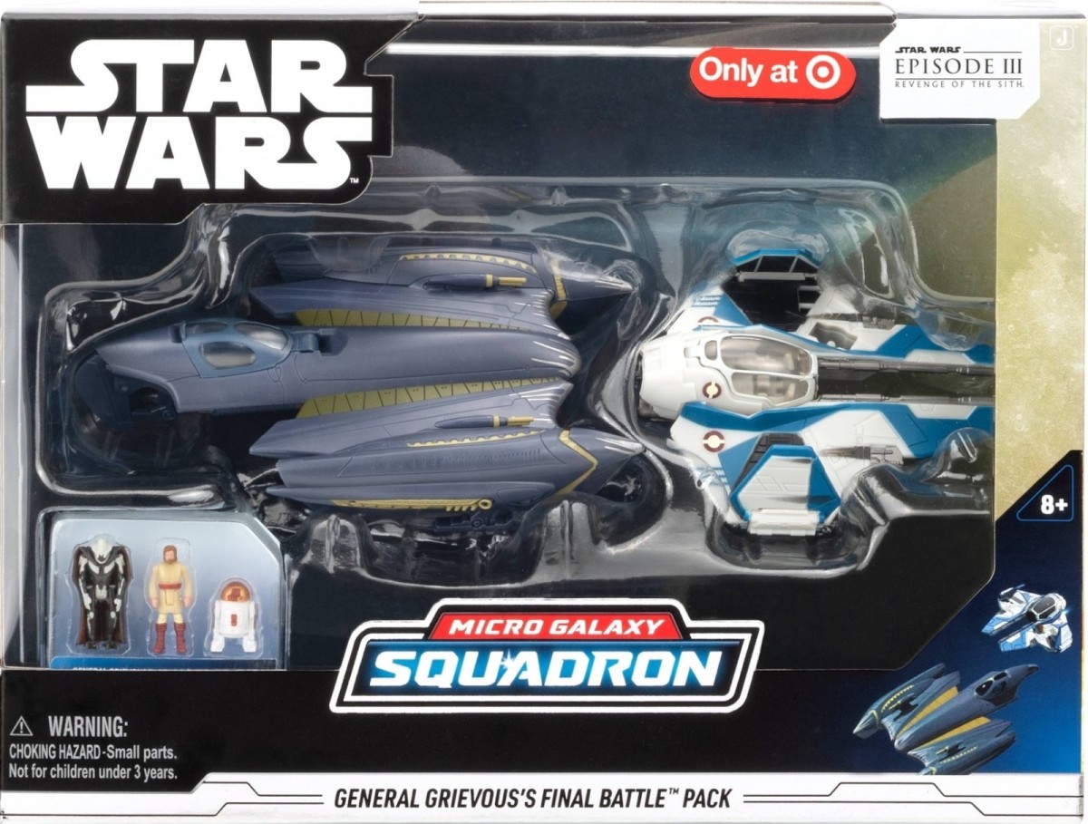 Finally, play out these epic adventures with 1-inch micro figure accessories of Obi-Wan Kenobi, R4-G9, and General Grievous, all compatible with all other STAR WARS Micro Galaxy Squadron vehicles.