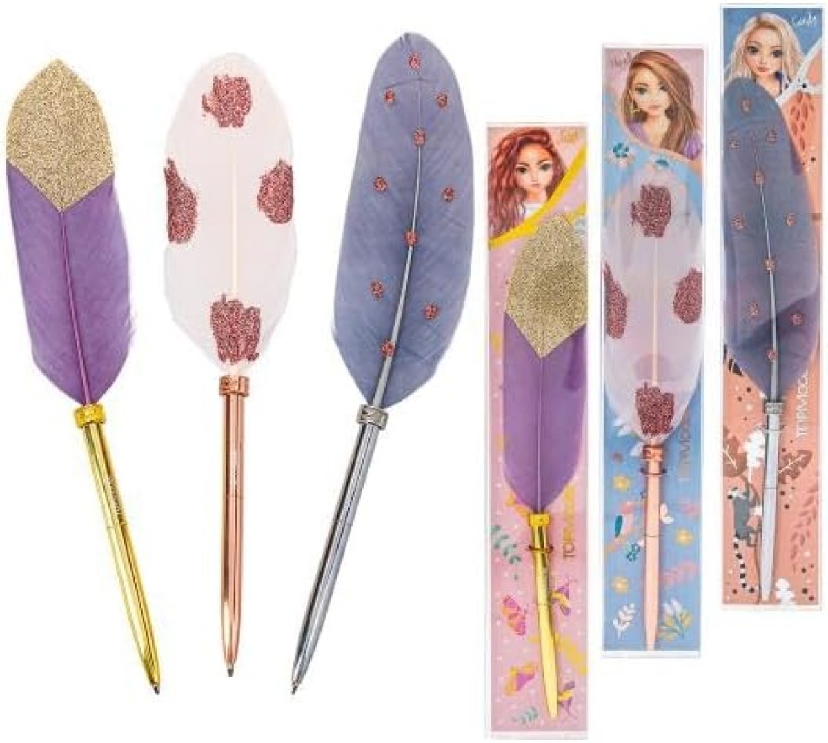 Write beautifully with the feather pens from TOPModel. Three beautiful designs are available: rose gold barrel with rainbow feather, gold barrel with pink heart feather and silver barrel with delicate batik gradient in the feather.