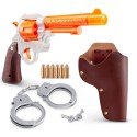 • Includes a light-up blaster with rotating barrel, 12 rounds, handcuffs, and holster.